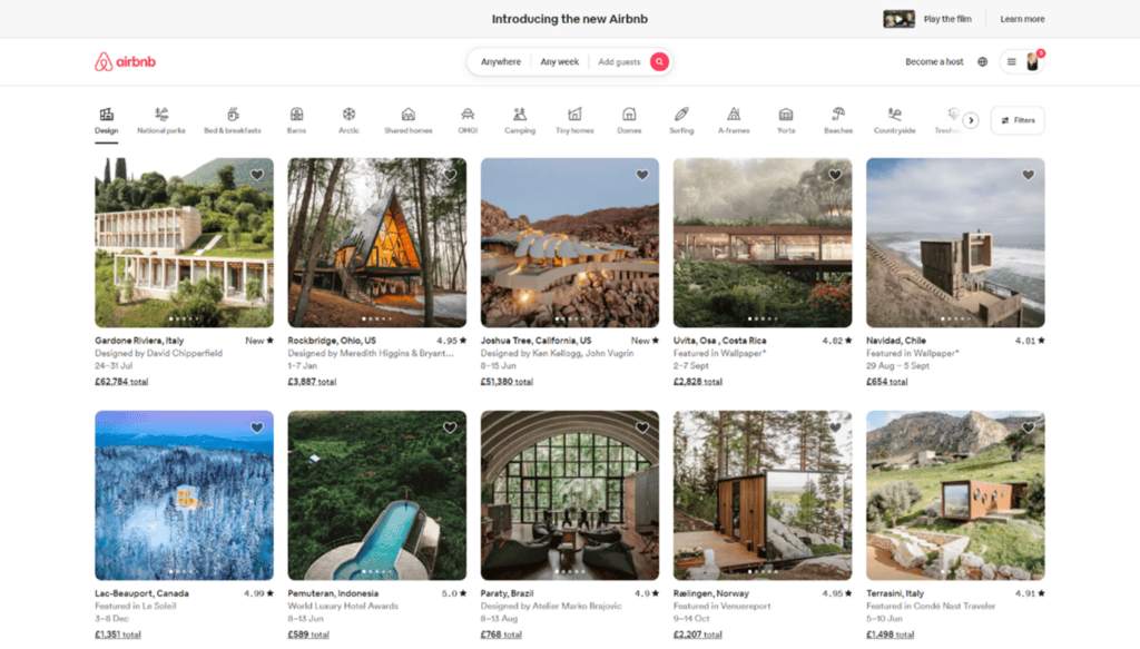 Now, the new homepage provides website users with an array of quirky accommodation options, alongside the same search functionality. To further support the large range of accommodation that’s on offer, Airbnb also added in filtering functionality. And this allows users to search for anything from “OMG!” to “Tiny home” categories.