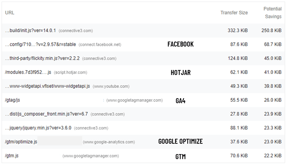 Enabling measurement can cause some speed decreases. It’s not uncommon to see marketing scripts flagged as an issue in page speed reports. See below, where half of the results flagged are marketing technologies: